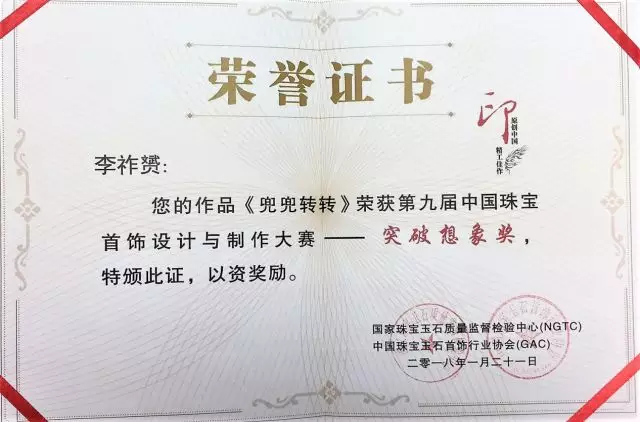 近日,在第九届中国珠宝首饰设计与制作大赛中,我院李祚赟同学凭借作品《兜兜转转》,荣获“突破想象奖”。