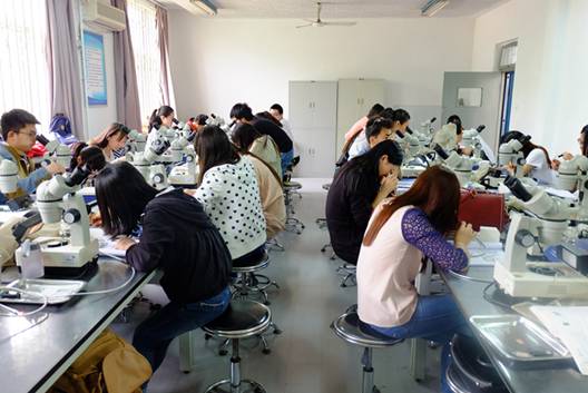 为了培养理论与实践并重,具有较高综合素质与创新能力,适应社会发展需要的人才,我院建设了高水平的“珠宝首饰与矿物加工实验中心”,被评定为河北省普通高等学校实验教学示范中心。实验中心下设宝石鉴定、钻石分级、矿石及工艺矿物、磁电选矿、首饰金工、玉石雕刻等17个实验室,设备投资总金额729万元,实验设备953台,钻石样品185枚,其它珠宝玉石样品3420件。实验室总面积4040平方米,每年实验48600人次。教学实验实习的仪器设备和标本样品充足,图书资料齐全,为同学们实践实训提供了良好条件。2017年建成河北地质大学珠宝产学研基地,为师生开展实验实习和创业提供了很好的场所。